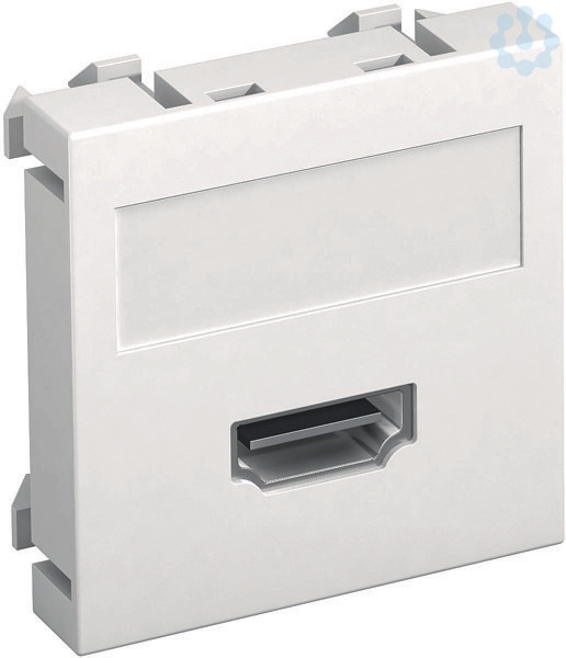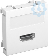 Multimediaträger mit einer HDMI-Anschlussbuchse, Kabelauslass gerade, mit Beschriftungsfeld, HDMI-Buchse mit Schraubanschluss. Trägerplatte mit Rastbefestigung, geeignet für den waagerechten und senkrechten Einbau in die Systemumgebung.