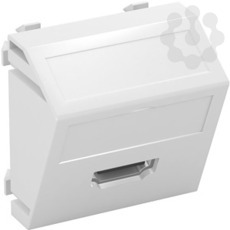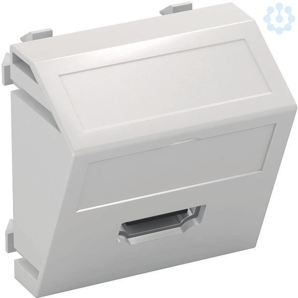 Multimediaträger mit einer HDMI-Anschlussbuchse, Kabelauslass schräg, mit Beschriftungsfeld, HDMI-Buchse mit Schraubanschluss. Trägerplatte mit Rastbefestigung, geeignet für den waagerechten und senkrechten Einbau in die Systemumgebung.