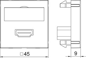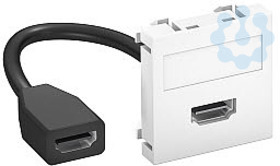 Multimediaträger mit einer HDMI-Anschlussbuchse, Kabelauslass gerade, mit Beschriftungsfeld, kurzes HDMI-Anschlusskabel in Ausführung Buchse-Buchse. Trägerplatte mit Rastbefestigung, geeignet für den waagerechten und senkrechten Einbau in die Systemumgebung.