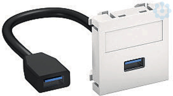 Multimediaträger mit einer USB 3.0-Anschlussbuchse, Kabelauslass gerade, mit Beschriftungsfeld, kurzes USB 3.0 Typ A-Anschlusskabel in Ausführung Buchse-Buchse. Trägerplatte mit Rastbefestigung, geeignet für den waagerechten und senkrechten Einbau in die Systemumgebung.