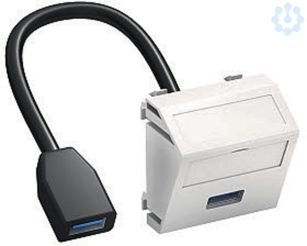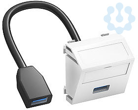 Multimediaträger mit einer USB 3.0-Anschlussbuchse, Kabelauslass schräg, mit Beschriftungsfeld, kurzes USB 3.0 Typ A-Anschlusskabel in Ausführung Buchse-Buchse. Trägerplatte mit Rastbefestigung, geeignet für den waagerechten und senkrechten Einbau in die Systemumgebung.
