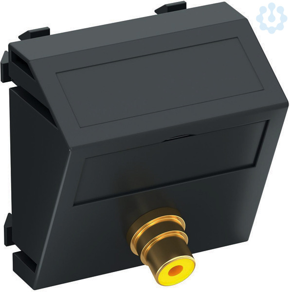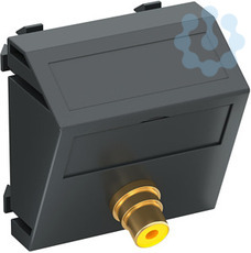 Multimediaträger mit einer Cinch-Anschlussbuchse für Composite Video, Kabelauslass schräg, mit Beschriftungsfeld, Cinch-Kupplung (RCA) in Ausführung Buchse-Buchse, Farbkodierung gelb. Trägerplatte mit Rastbefestigung, geeignet für den waagerechten und senkrechten Einbau in die Systemumgebung.
