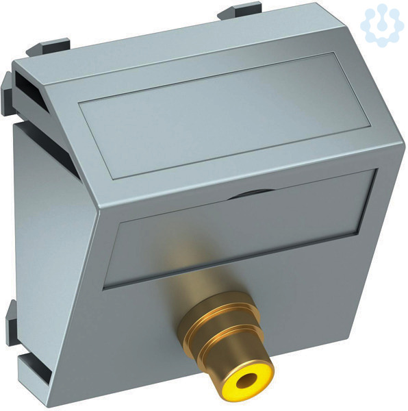 Multimediaträger mit einer Cinch-Anschlussbuchse für Composite Video, Kabelauslass schräg, mit Beschriftungsfeld, Cinch-Kupplung (RCA) in Ausführung Buchse-Buchse, Farbkodierung gelb. Trägerplatte mit Rastbefestigung, geeignet für den waagerechten und senkrechten Einbau in die Systemumgebung.