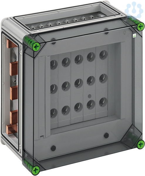 NEOZED(R)-Reiter-Sicherungsgehäuse, 5 x 3-polige D02-Reiter-Sicherungssockel, E 18-Gewinde, Bemessungsstrom 63 A, Schraubanschluss 1,5-25mm², auf Sammelschiene 5-polig, mit 5 Sammelschienenklemmen 4-35mm², N-Klemmen 1,5-16mm², PE-Klemmen 1,5-16mm², 3 x Gehäuseverbinder (GGV), auf Sammelschienensystem 630 A, mit transparentem Deckel