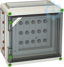 NEOZED(R)-Reiter-Sicherungsgehäuse, 5 x 3-polige D02-Reiter-Sicherungssockel, E 18-Gewinde, Bemessungsstrom 63 A, Schraubanschluss 1,5-25mm², auf Sammelschiene 5-polig, mit 5 Sammelschienenklemmen 4-35mm², N-Klemmen 1,5-16mm², PE-Klemmen 1,5-16mm², 3 x Gehäuseverbinder (GGV), auf Sammelschienensystem 250 A, mit transparenter Klapptür