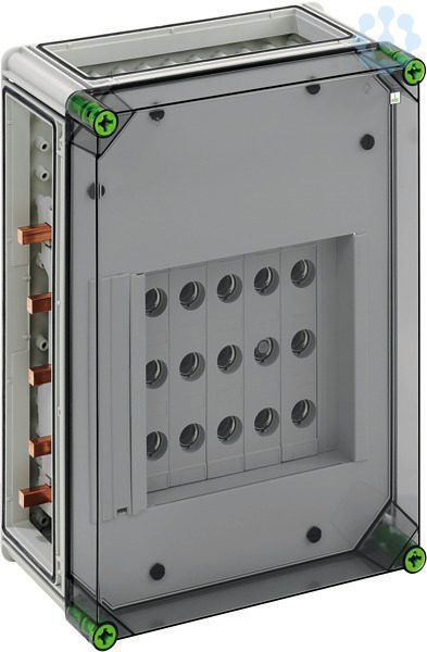 NEOZED(R)-Reiter-Sicherungsgehäuse mit zusätzlichem Anschlussraum, 5 x 3-polige D02-Reiter-Sicherungssockel, E 18-Gewinde, Bemessungsstrom 63 A, Schraubanschluss 1,5-25mm², auf Sammelschiene 5-polig, mit 5 Sammelschienenklemmen 16-70mm², N-Klemmen 1,5-16mm², PE-Klemmen 1,5-16mm², 3 x Gehäuseverbinder (GGV), auf Sammelschienensystem 250 A, mit transparentem Deckel