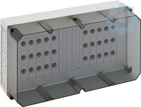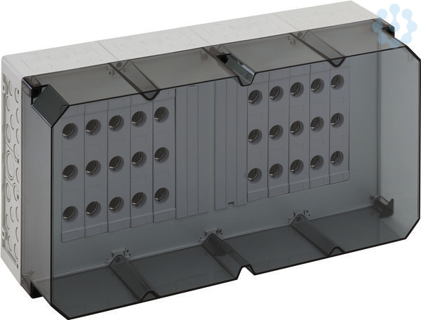 NEOZED(R)-Reiter-Sicherungsgehäuse, 10 x 3-polige D02-Reiter-Sicherungssockel, E 18-Gewinde, Bemessungsstrom 63 A, Schraubanschluss 1,5-25mm², auf Sammelschiene 5-polig, N-Klemmen 1,5-16mm², PE-Klemmen 1,5-16mm², auf Sammelschienensystem 250 A, mit transparentem Deckel