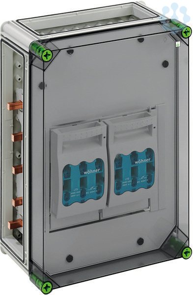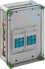 NH-Reiter-Sicherungs-Lasttrennschaltergehäuse mit zusätzlichem Anschlussraum, 2 x NH 00-Reiter-Sicherungs-Lasttrennschalter, Bemessungsstrom 125 A, Schellenanschluss 1,5-70mm², Abgang oben, auf Sammelschiene 5-polig, N-Klemmen 4-35mm², PE-Klemmen 4-35mm², 3 x Gehäuseverbinder (GGV), auf Sammelschienensystem 250 A, mit transparentem Deckel