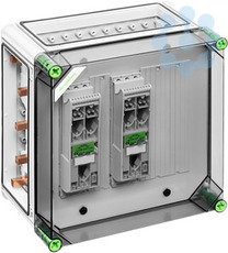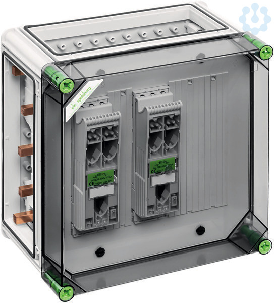 NH-Reiter-Sicherungs-Lasttrennschaltergehäuse, 2 x NH 000-Reiter-Sicherungs-Lasttrennschalter, Fahrstuhlklemme 1,5-50mm², Abgang unten, auf Sammelschiene 5-polig, mit 5 Sammelschienenklemmen zum direkten Anschluss eines Kabels an das Sammelschienensystem, zusätzliche N- und PE-Klemme für jeden Trennschalter, 3 x Gehäuseverbinder (GGV), Sammelschienensystem 630 A, mit transparentem Deckel