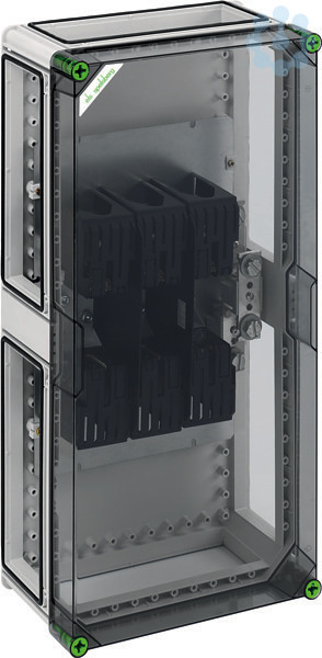 NH-Sicherungsgehäuse, 1 x NH 2-Sicherungsunterteil, Schraubanschluss M10, PE/N-Klemme M12, montiert auf Montageplatte, 4 x Gehäuseverbinder (GGV), mit transparentem Deckel