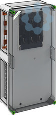 NH-Reiter-Sicherungsgehäuse, 1 x NH 1-Reiter-Sicherungsunterteil, Schraubanschluss M10, Abgang unten, auf Sammelschiene 5-polig, N-Klemme 16-120mm², PE-Klemme 16-120mm², 4 x Gehäuseverbinder (GGV), auf Sammelschienensystem 250 A, mit transparentem Deckel