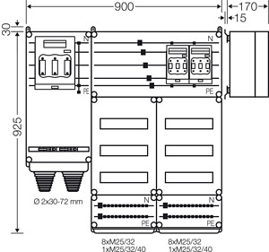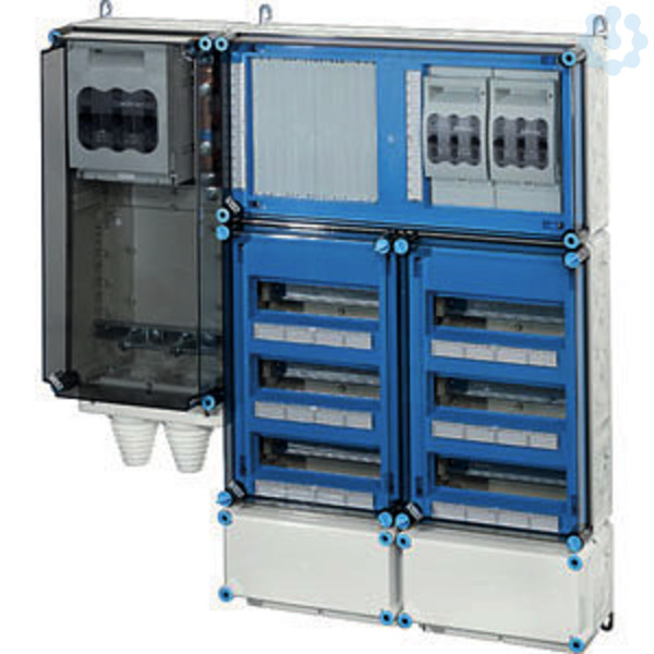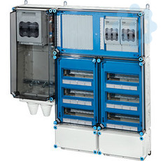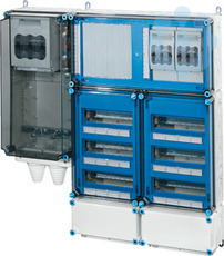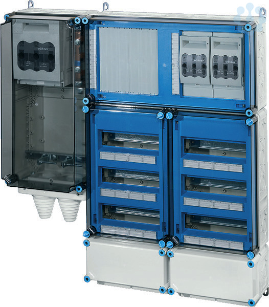 Wechselrichter-Sammler nach IEC 61439 für PV-Anlagen werden als Komplett-Set geliefert. Die Gehäuse aus hochwertigem Thermoplast sind schutzisoliert, Schutzart IP 54/IP 65. Wechselrichter-Sammler können um die Funktion Blitz- und Überspannungsschutz oder Fehlerstromschutz (RCD) erweitert werden. Sie sind für die geschützte Installation im Freien geeignet und UV-beständig. PV-Wechselrichter-Sammler bis 140 kVA mit Automatengehäuse. Max. 36 x 1~ Wechselrichter oder 12 x 3~ Wechselrichter. Wandbefestigung über Außenlaschen aus Edelstahl.