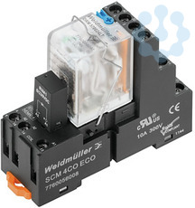 Baugruppe aus Steckrelais und Stecksockel. Steuerstromkreis und Laststromkreis sind galvanisch getrennt.
