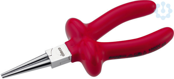 Rundzange (Langbeckzange), Griffe mit zweifarbiger Kunststoff-Tauchisolation für optimale Sicherheit. Bei Beschädigung der äußeren roten Isolationsschicht signalisiert die nun sichtbare untere orangefarbene Kunststoffisolation, dass nicht mehr eine 100-prozentige Sicherheit gemäß den Sicherheitsnormen gegeben ist. Rundzange (Langbeckzange) DIN ISO 5745, 1.000 V, Länge 160 mm (6"), mit eingelegtem Gelenk und lange, runde Backen, Backenlänge 50 mm, fein gezahnte Greifflächen