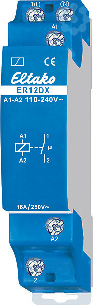 1 Schließer potenzialfrei 16A/250V AC, 230V-LED-Lampen bis 600W, Glühlampen 2000W. Kein Stand-by-Verlust. Reiheneinbaugerät für Montage auf Tragschiene DIN-EN 60715 TH35. 1 Teilungseinheit = 18mm breit, 58mm tief. Modernste Hybrid-Technik vereint die Vorteile verschleißfreier elektronischer Ansteuerung mit der hohen Leistung von Spezialrelais. Mit der patentierten ELTAKO-Duplex-Technologie (DX) können die normalerweise potenzialfreien Kontakte beim Schalten von 110-240V AC 50Hz trotzdem im Nulldurchgang schalten und damit den Verschleiß drastisch reduzieren. Hierzu einfach den N-Leiter an die Klemme (N) und L an 1(L) anschließen. Dadurch ergibt sich ein Stand-by-Verlust von nur 0,1 Watt. Wird der Kontakt zum Steuern von Schaltgeräten verwendet, welche selbst nicht im Nulldurchgang schalten, sollte (N) nicht angeschlossen werden, da der zusätzliche Schließverzug sonst das Gegenteil bewirkt. Steuerspannung 110-240V AC. Sehr geringes Schaltgeräusch. Ansteuerungsanzeige mit Leuchtdiode. Die Anschlussklemmenbelegung ist identisch mit dem elektromechanischen Schaltrelais R12-100-. Durch die Verwendung eines bistabilen Relais gibt es auch im eingeschalteten Zustand keine Spulen-Verlustleistung und keine Erwärmung hierdurch. Der Relaiskontakt kann bei der Inbetriebnahme offen oder geschlossen sein und synchronisiert sich bei der ersten Betätigung. Dieses Relais ist nicht zur Rückmeldung mit der Schaltspannung eines Dimmschalters geeignet. Hierzu nur die Relais ESR12DDX-UC, ESR12NP-230V+UC oder ESR61NP-230V+UC verwenden. Die Elektronik hat keine eigene Stromversorgung und daher keinen Stand-by-Verlust. Erst beim Schließen des Steuerkontaktes wird der Mikrocontroller aktiviert, welcher das bistabile Relais in die richtige Richtung schaltet. Beim Öffnen des Steuerkontaktes oder abfallender Steuerspannung wird zurückgeschaltet.