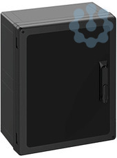 Schaltschrank, geeignet für die Installation in rauen Umgebungen und im ungeschützten Außenbereich, Kasten und Rahmen: glasfaserverstärktes Polycarbonat, schwarz, ähnlich RAL 9005, Tür: Polycarbonat.