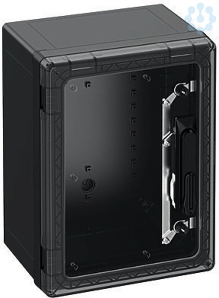 Schaltschrank, geeignet für die Installation in rauen Umgebungen und im ungeschützten Außenbereich, Kasten und Rahmen: glasfaserverstärktes Polycarbonat, schwarz, ähnlich RAL 9005, Tür: Polycarbonat.