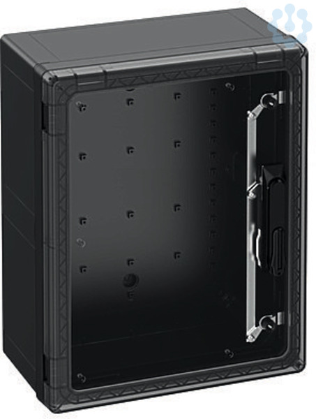 Schaltschrank, geeignet für die Installation in rauen Umgebungen und im ungeschützten Außenbereich, Kasten und Rahmen: glasfaserverstärktes Polycarbonat, schwarz, ähnlich RAL 9005, Tür: Polycarbonat.