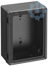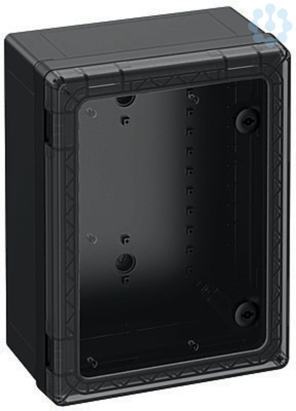 Schaltschrank, geeignet für die Installation in rauen Umgebungen und im ungeschützten Außenbereich, Kasten und Rahmen: glasfaserverstärktes Polycarbonat, schwarz, ähnlich RAL 9005, Tür: Polycarbonat.