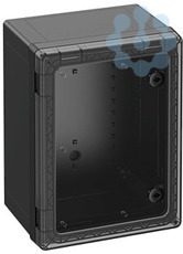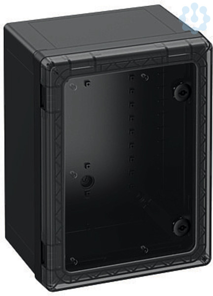 Schaltschrank, geeignet für die Installation in rauen Umgebungen und im ungeschützten Außenbereich, Kasten und Rahmen: glasfaserverstärktes Polycarbonat, schwarz, ähnlich RAL 9005, Tür: Polycarbonat.