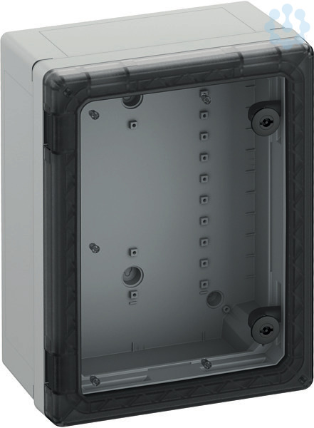 Schaltschrank, geeignet für die Installation in rauen Umgebungen und im ungeschützten Außenbereich, Kasten und Rahmen: glasfaserverstärktes Polycarbonat, grau, ähnlich RAL 7035, Tür: Polycarbonat.