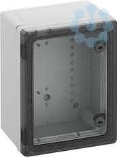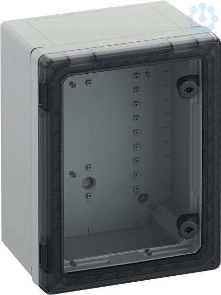 Schaltschrank, geeignet für die Installation in rauen Umgebungen und im ungeschützten Außenbereich, Kasten und Rahmen: glasfaserverstärktes Polycarbonat, grau, ähnlich RAL 7035, Tür: Polycarbonat.