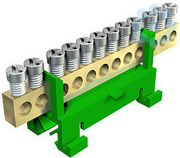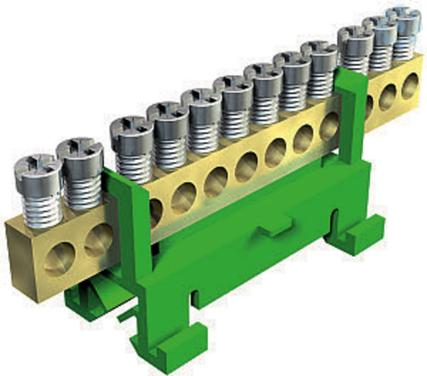 Klemmschiene Messing, Schrauben Stahl, galvanisch verzinkt und transparent passiviert, zum Aufrasten auf Hutprofilschiene 35 x 7,5 mm nach DIN EN 60715 (früher DIN EN 50022) (quer) oder Flachschienen 10 x 2-2,5 mm (längs).