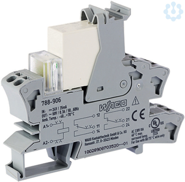 Relaismodul mit zwangsgeführten Kontakten; Eingangsnennspannung DC 24 V; 2 Wechsler; Grenzdauerstrom 0,3 A; Statusanzeige grün; 15 mm Baubreite
