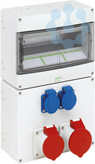 Steckdosenkombination, mit Schutzart IP44, geeignet zum kundenseitigen Einbau von Reiheneinbaugeräten, mit eingebauten, auf PE-/N-Klemme vorverdrahteten Steckdosen, hohe mechanische Belastbarkeit, temperaturunempfindlich, kombinierbar, halogenfrei