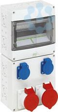 Steckdosenkombination, mit Schutzart IP44, geeignet zum kundenseitigen Einbau von Reiheneinbaugeräten, mit eingebauten, auf PE-/N-Klemme vorverdrahteten Steckdosen, hohe mechanische Belastbarkeit, temperaturunempfindlich, kombinierbar, halogenfrei