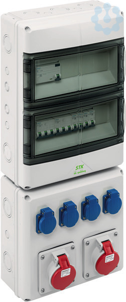 Steckdosenkombination, mit Schutzart IP44, anschlussfertig nach EN61439-3, mit zentraler Anschlussklemme 4-25mm², 5-polig, auch geeignet zum Durchschleifen der Zuleitung, werkzeuglos entnehmbare Normschienen zur einfachen Leitungsverlegung im Gehäuse, CEE-Steckdosen mit 20°Neigung, einfache Kombination mit STK-Zusatzgehäusen oder AK Air Verteilern mit Flanschöffnungen (AK-F), inkl. Flansche, verfügbare Teilungseinheiten: 28