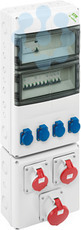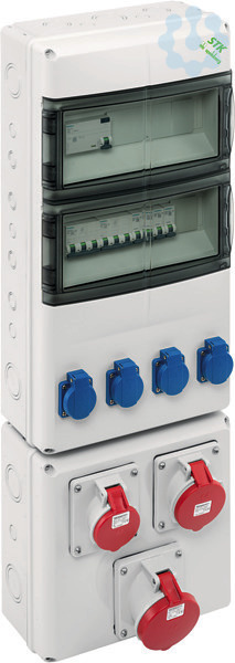 Steckdosenkombination, mit Schutzart IP44, anschlussfertig nach EN61439-3, mit zentraler Anschlussklemme 4-25mm², 5-polig, auch geeignet zum Durchschleifen der Zuleitung, werkzeuglos entnehmbare Normschienen zur einfachen Leitungsverlegung im Gehäuse, CEE-Steckdosen mit 20°Neigung, einfache Kombination mit STK-Zusatzgehäusen oder AK Air Verteilern mit Flanschöffnungen (AK-F), inkl. Flansche, verfügbare Teilungseinheiten: 28