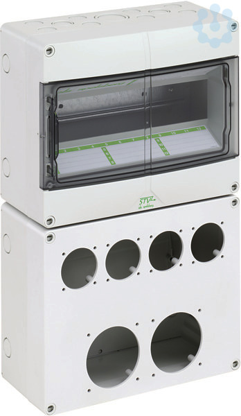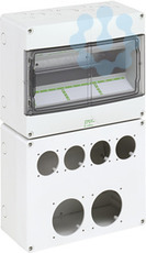 Steckdosenleergehäuse, mit Schutzart IP44, geeignet zum kundenseitigen Einbau von Reiheneinbaugeräten und Anbausteckdosen, inkl. PE-/N-Klemme sowie Adaptern und Schrauben zur Montage der Steckdosen, hohe mechanische Belastbarkeit, temperaturunempfindlich, kombinierbar, halogenfrei