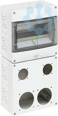 Steckdosenleergehäuse, mit Schutzart IP44, geeignet zum kundenseitigen Einbau von Reiheneinbaugeräten und Anbausteckdosen, inkl. PE-/N-Klemme sowie Adaptern und Schrauben zur Montage der Steckdosen, hohe mechanische Belastbarkeit, temperaturunempfindlich, kombinierbar, halogenfrei