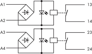 Relaismodul; 2-fach; Eingangsnennspannung AC/DC 24 V; 1 Schließer; Grenzdauerstrom 4 A; Statusanzeige gelb; 6 mm Baubreite; 2,50 mm²