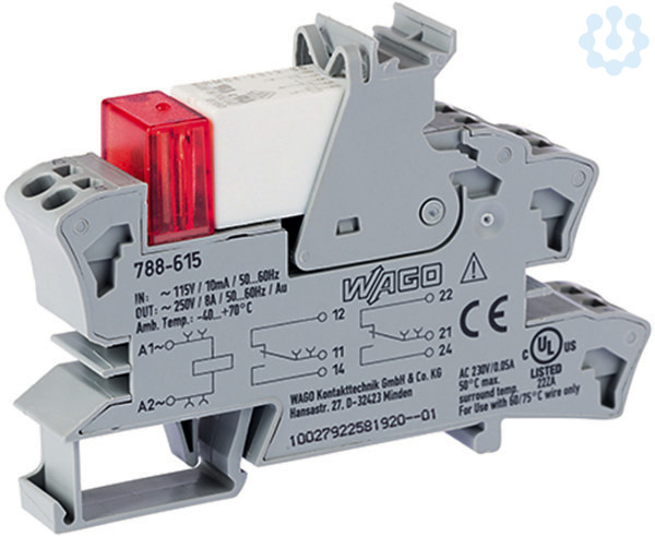 Relaismodul; Eingangsnennspannung AC 115 V; 2 Wechsler; Grenzdauerstrom 8 A; mit Goldkontakten; Statusanzeige rot; 15 mm Baubreite; 2,50 mm²; grau