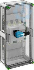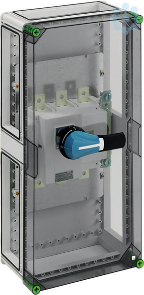 Lasttrennschaltergehäuse mit externer Betätigung, abschließbar, 1 x Lasttrennschalter 400A, 3-polig schaltend, Schraubanschluss M10, PE/N-Klemme M12, 4 x Gehäuseverbinder (GGV), mit transparentem Deckel