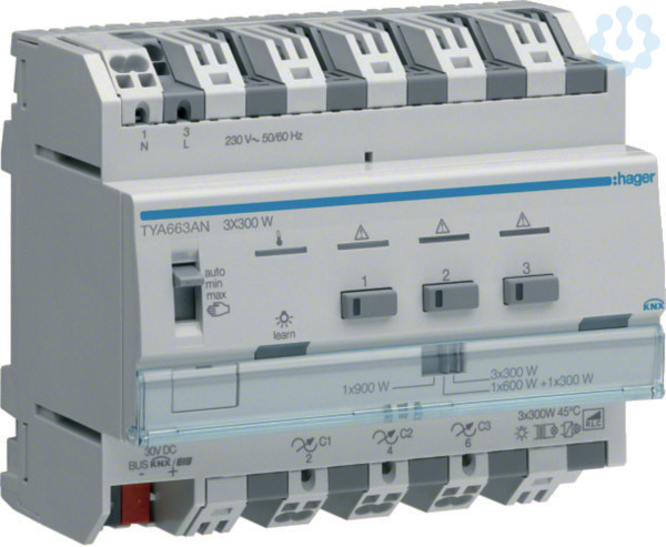 Funktionen: Dimmen, Schalten, Zwang, Zeit, Ausschaltvorwarnung, Szenenabruf (64 pro Kanal, jeweils mit eigener Anfahrzeit). Jeder Dimmausgang hat am Gerät eine Handbedienung, die auch sperrbar ist, und eine Schaltzustandsanzeige per LED. Die 3 Dimmkanäle können in verschiedenen Kombinationen zur Leistungserhöhung zusammengeschaltet werden. Mit Schutz gegen Überhitzung, Überlast und Kurzschluss. Beschriftungsmöglichkeit direkt am Gerät. Zusätzlich erkennt das Gerät über ein Statusobjekt den Stromfluss des Leuchtmittels.