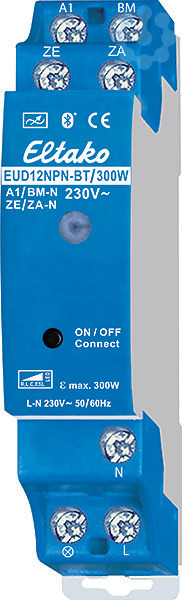 Universal-Dimmschalter mit integrierter Schaltuhr, Bluetooth und ELTAKO Connect-App. Power MOSFET bis 300W. Automatische Lampenerkennung. Stand-by-Verlust nur 0,3 Watt. Mindesthelligkeit, Maximalhelligkeit, Dimmgeschwindigkeit, Kinderzimmerschaltung, Schlummerschaltung, Bewegungsmelder, Ein, Aus, TI, ER, ESV, TLZ, MIN, MMX, Programme mit Zeit- oder Astrofunktion, Zeitversatz Sonnenwende, Datum und Uhrzeit, Standort und Bluetooth können gemäß der Bedienungsanleitung, über die App eingestellt werden. Reihenbaugerät für Montage auf Tragschiene DIN-EN-60715 TH35. 1 Teilungseinheit = 18mm breit, 58mm tief. Universal-Dimmschalter für Lampen bis 300W, abhängig von den Lüftungsverhältnissen. Dimmbare 230V-LED-Lampen und dimmbare Energiesparlampen zusätzlich abhängig von der Lampenelektronik und der Dimmart. Schaltung im Nulldurchgang mit Soft-Ein und Soft-Aus zur Lampenschonung. Steuer-, Versorgungs- und Schaltspannung 230V. Die integrierte Schaltuhr hat bis zu 10 Programm-Speicherplätze. Mit Datum und automatischer Sommerzeit/Winterzeit-Umstellung. Gangreserve ohne Batterie ca. 5 Tage. Jeder Speicherplatz kann entweder mit der Astro-Funktion (automatisches Schalten nach Sonnenaufgang bzw. -untergang), oder einer der 9 Funktionen (Ein, Aus, Ein mit Dimmwert in %, Ein mit Memorywert, Lichtwecker, Schlummerschaltung, Ein mit Resthelligkeit, Aus mit Resthelligkeit, TI) belegt werden. Bei einem Stromausfall werden die Schaltstellung und die Helligkeitsstufe gespeichert und wird gegebenenfalls bei Wiederkehr der Versorgungsspannung eingeschaltet. Automatische elektronische Überlastsicherung und Übertemperatur-Abschaltung. Im Auslieferzustand ist die Betriebsart Auto aktiv. Kurze Steuerbefehle am örtlichen Steuereingang schalten ein/aus, permanente Ansteuerung verändert die Helligkeit bis zum maximalen Wert. Eine Unterbrechung der Ansteuerung ändert die Dimmrichtung. Die Zentralsteuerung ist aktiv, mit Priorität und der Bewegungsmelder schaltet mit dem Memorywert ein. Um die Betriebsart zu ändern oder zu konfigurieren, muss die Verbindung mit der ELTAKO Connect-App hergestellt werden. Dimmschalter mit der App verbinden: Taste an der Front für 6 Sekunden drücken, die blaue LED blinkt. Nun kann die Verbindung mit der App hergestellt werden (Auslieferzustand PIN123123). Das Blinken der blauen LED signalisiert die Kopplungsbereitschaft, diese endet automatisch nach 3 Minuten, kann aber auch durch einen Tastendruck >6 Sekunden manuell beendet werden. QR-Code auf der Bedienungsanleitung scannen, die App führt durch den Anlernvorgang. Nachdem die Verbindung zur App hergestellt wurde, leuchtet die blaue LED dauerhaft. Wird die Verbindung nicht über die App getrennt, wird diese nach 20 Minuten ohne Interaktion mit der App automatisch getrennt. Nach dem Trennen der Verbindung über die App signalisiert der Dimmschalter wieder seine Kopplungsbereitschaft und die blaue LED blinkt. PIN ändern: Der PIN für die Bluetooth-Verbindung kann in der App, unter dem Eintrag Geräte-PIN geändert werden. Bluetooth-Reset (evtl. geänderten PIN löschen): Den Taster an der Front 8-mal kurz tippen. Die Dimmwert-Einstellung Auto lässt das Dimmen aller Lampenarten zu. Phasenanschnitt LC1-LC3 sind Comfort-Stellungen mit verschiedenen Dimmkurven für dimmbare 230V-LED-Lampen, welche sich auf Auto konstruktionsbedingt nicht weit genug abdimmen lassen und daher auf Phasenanschnitt gezwungen werden müssen. Phasenabschnitt LC4-LC6 sind Comfort-Stellungen mit verschiedenen Dimmkurven für dimmbare 230V-LED-Lampen, welche sich auf Auto nicht weit genug abdimmen lassen. In den Einstellungen Phasenanschnitt und Phasenabschnitt dürfen keine induktiven (gewickelten) Trafos verwendet werden. Außerdem kann die maximale Anzahl an Lampen konstruktionsbedingt niedriger sein als im Automatikbetrieb. Durch kurzes Drücken auf den Taster an der Front, kann immer manuell ein- und ausgeschaltet werden. Über den Steuereingang A1 wird mit einem Universaltaster impulsweise gesteuert. Über die Diode RTD (Polung beliebig) kann ein Richtungstaster für aus angeschlossen werden. Ein weiterer Richtungstaster für ein wird direkt an A1 angeschlossen. Beim 1. Steuerimpuls aus schaltet der Dimmschalter den Steuereingang A1 auf Richtungstaster um. Um den Steuereingang A1 wieder auf Universaltaster umzuschalten, muss die Versorgungsspannung kurz weggeschaltet werden, oder in der App, unter Grundeinstellungen, umgeschaltet werden. Über den Steuereingang BM kann ein Bewegungsmelder angeschlossen werden. Über die zusätzlichen Steuereingänge ZE und ZA wird zentral ein und zentral aus mit Priorität gesteuert. Mit Priorität deswegen, weil diese Steuereingänge nicht von anderen Steuereingängen übersteuert werden können, solange der Zentral-Steuerkontakt geschlossen ist. Das Leuchten der grünen LED signalisiert die Ansteuerung von einem der vier Steuereingänge.