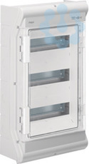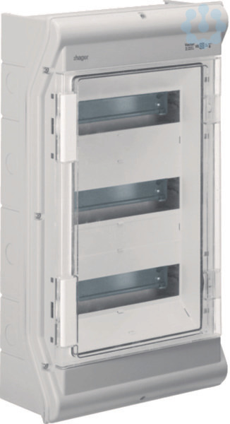 Kleinverteiler, vector, APV, IP65, 36PLE, UV-stabil, ohne Leitungseinführung.Installationskleinverteiler aus Polycarbonat (UV-beständig), nach DIN EN 60670-24, nach DIN 43871. Zum Einbau von Geräten bis 63 A nach Maßnorm DIN 43 880 mit 70 mm oder 85 mm Einbautiefe, Bemessungsspannung AC 400 V/50 Hz. Bestehend aus Kunststoffunterteil mit Hutprofilschiene aus verzinktem Stahlblech, Vorprägung für metrische Leitungseinführungstüllen (oben, unten), seitliche Vorprägungen für Verbindungstüllen zur Verbindung von zwei oder mehreren Verteilern nebeneinander. Oberteil mit 46 mm Geräteschlitz. Klarsichttür frontbündig, rechts oder links anschlagbar, plombierbar, abschließbar, Verteiler anflanschbar.