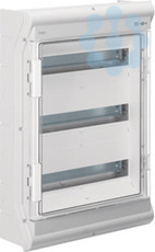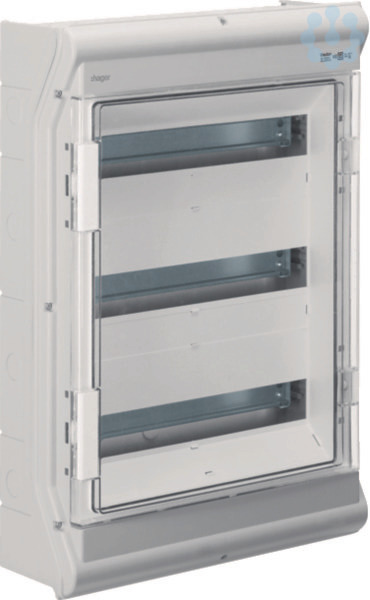 Kleinverteiler, vector, APV, IP65, 54PLE, UV-stabil, ohne Leitungseinführung.Installationskleinverteiler aus Polycarbonat (UV-beständig), nach DIN EN 60670-24, nach DIN 43871. Zum Einbau von Geräten bis 63 A nach Maßnorm DIN 43 880 mit 70 mm oder 85 mm Einbautiefe, Bemessungsspannung AC 400 V/50 Hz. Bestehend aus Kunststoffunterteil mit Hutprofilschiene aus verzinktem Stahlblech, Vorprägung für metrische Leitungseinführungstüllen (oben, unten), seitliche Vorprägungen für Verbindungstüllen zur Verbindung von zwei oder mehreren Verteilern nebeneinander. Oberteil mit 46 mm Geräteschlitz. Klarsichttür frontbündig, rechts oder links anschlagbar, plombierbar, abschließbar, Verteiler anflanschbar.