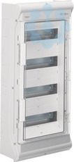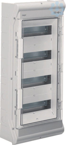 Kleinverteiler, vector, APV, IP65, 48PLE, UV-stabil, ohne Leitungseinführung.Installationskleinverteiler aus Polycarbonat (UV-beständig), nach DIN EN 60670-24, nach DIN 43871. Zum Einbau von Geräten bis 63 A nach Maßnorm DIN 43 880 mit 70 mm oder 85 mm Einbautiefe, Bemessungsspannung AC 400 V/50 Hz. Bestehend aus Kunststoffunterteil mit Hutprofilschiene aus verzinktem Stahlblech, Vorprägung für metrische Leitungseinführungstüllen (oben, unten), seitliche Vorprägungen für Verbindungstüllen zur Verbindung von zwei oder mehreren Verteilern nebeneinander. Oberteil mit 46 mm Geräteschlitz. Klarsichttür frontbündig, rechts oder links anschlagbar, plombierbar, abschließbar, Verteiler anflanschbar.