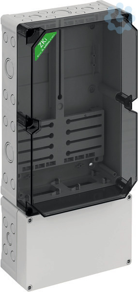 Zählergehäuse, mit transparentem Deckel, serienmäßig plombierbar, mit montiertem Zählerkreuz und Zählerbefestigungsschrauben, zusätzlicher Anschlussraum unten 150mm mit 35mm Normschiene, mit Doppelmembranstutzen, Verschluss- und Isolierstopfen, geeignet für Rundsteuerempfänger nach DIN 43861-2, für Zähler mit Drei-Punkt-Befestigung und einer Tiefe von max. 80mm