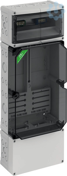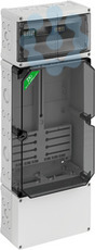 Zählergehäuse, mit transparentem Deckel, serienmäßig plombierbar, mit montiertem Zählerkreuz und Zählerbefestigungsschrauben, zusätzlicher Anschlussraum unten 150mm mit 35mm Normschiene, serienmäßig plombierbarer Konsumentenraum oben, mit 35mm Normschiene und PE/N-Doppelklemmen, mit Doppelmembranstutzen, Verschluss- und Isolierstopfen, geeignet für Rundsteuerempfänger nach DIN 43861-2, für Zähler mit Drei-Punkt-Befestigung und einer Tiefe von max. 80mm